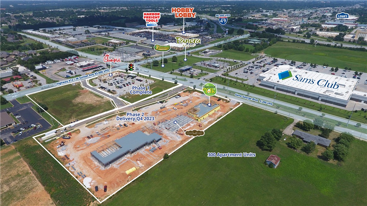 • Phase two now leasing of a new upscale mixed-use development including retail, restaurants, office and entertainment • Frontage on Highway 412 (W Sunset Avenue) and Gene George Blvd • Close proximity to Sam’s Club and Interstate 49 • Offers excellent access to I-49 north/south, Don Tyson Parkway and to Tontitown and Siloam Springs • Abundant new developments in the area including the Children’s Center for Health & Wellness, Highlands Oncology, Arkansas Children’s Hospital, Arkansas Blue Cross Blue Shield regional office building and under construction UAMS Sports & Orthopedic Medicine building at 185,000 square feet.