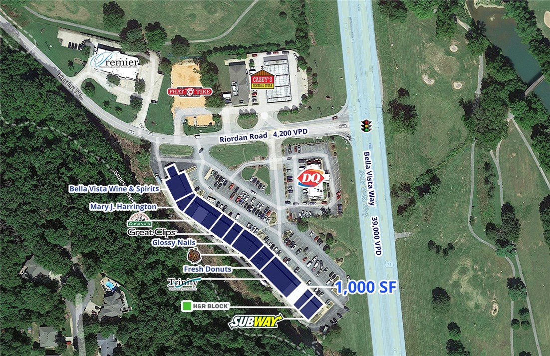 Rare opportunity to lease desirable retail or office space at Cunningham Corner in Bella Vista, Arkansas. Highly visible shopping center in the heart of the city surrounded by residential neighborhoods and near Kingswood Golf Course and Country Club, the Back 40 trailhead. Bella Vista Way (Highway 71) boasts more than 39,000 cars per day and is a main connector between Missouri commuters into the Northwest Arkansas market. Future plans nearby include an extension to the Razorback Greenway from Mercy Way to trailheads surrounding Cunningham Corner.