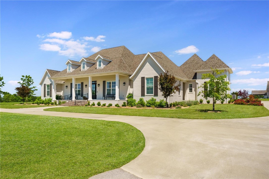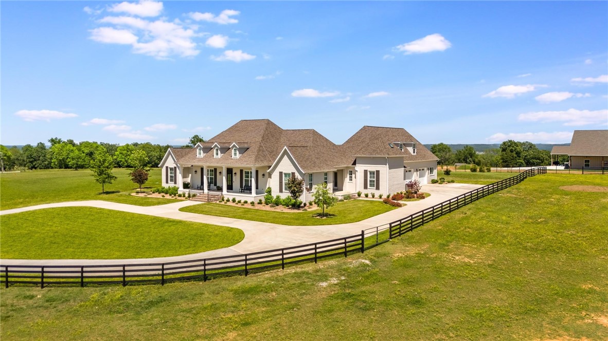 This custom home exudes timeless elegance sits on 4.99 acres & pond in east Fayetteville. Circle drive leads to large front porch, perfect for sunset views. Open floor plan features a living room that flows into the kitchen w/a large natural quartz island. Kitchen boasts extensive cabinetry, under-counter lighting,Fisher & Paykel appliances, 6-burner gas range, dbl ovens, microwave, dual dishwasher, & sub-zero refrigerator. Walk-in pantry has built-in desk area. Living room features a beamed ceiling, gas fireplace, and built-ins, opening to the spacious back porch with a fireplace, TV, gas grill, and ceiling fan. The media room offers theater seating, a 128" screen, surround sound, & top-of-the-line equipment. This home has 4 bedrooms, each w/ private bath. Upstairs includes large game room/bedroom w/ full bath & dbl vanities, + office w/skylight. Primary suite has radiant heated floors, his/her closets, one is safe room w/surveillance equipment. Heated & cooled garage & workshop feature epoxy flooring. .