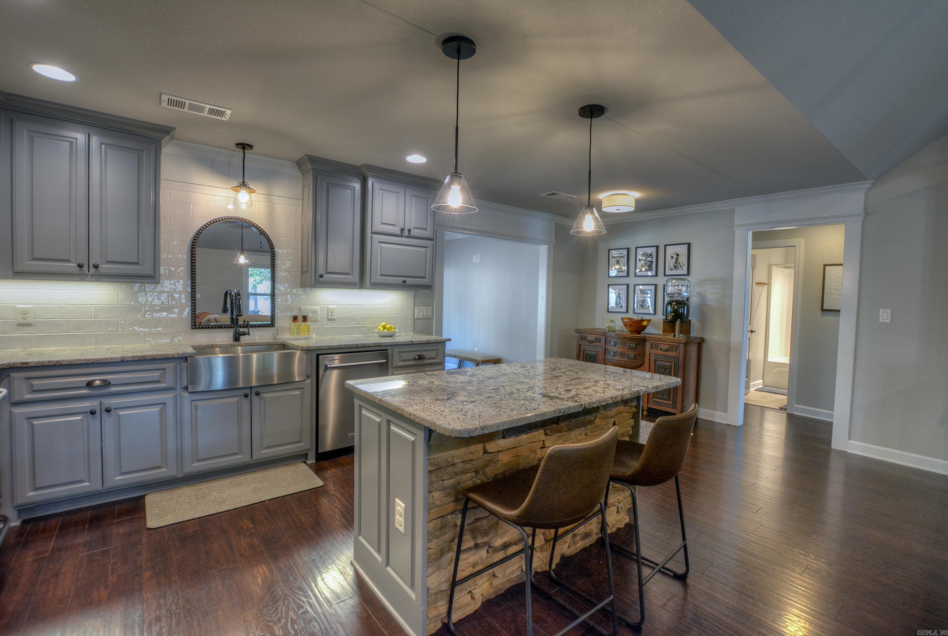 This charming 1½ story Craftsman-style brick home sits on a 0.63-acre lot just minutes from Garvan Gardens and Entergy Park. Featuring beautiful hardwood floors throughout, a vaulted ceiling and fireplace in the family room, and a luxurious primary suite with tray ceiling and en suite bath, this home blends comfort and style. With two additional bedrooms on the main floor, and a fourth bedroom upstairs that can serve as a guest suite or game room, there’s plenty of space. Outdoors, enjoy a covered patio, a custom playground in the fenced backyard, and an oversized two-car garage. Recent updates include a new roof, gutter guards, and steel insulated doors (2023). Perfectly maintained, this home offers modern style and a fantastic location. Don't miss this opportunity!